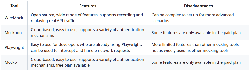 Here is a table summarizing the most important features and disadvantages of the four API mocking tools mentioned before: